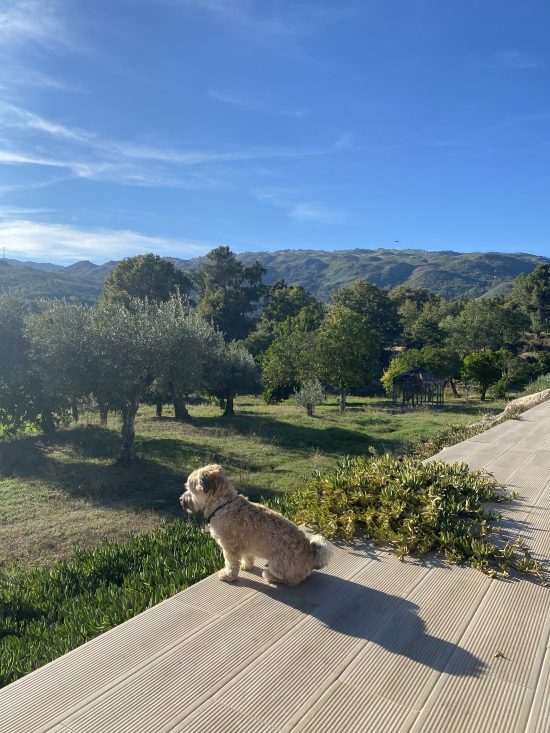 The Surprada family consists of Callie (Swiss/American) and Benoît (Swiss/French), a happy troupe of chickens, ducks, and guinea pigs, and three friendly quinta dogs: Pépé (the Havanese), Rex and Suki (the Serra da Estrelas).  Between us, we speak English, French, Spanish, German, and Portuguese. The property is an active working farm so we spend a lot of time outside but we value our guests’ privacy. Our goal is for visitors to feel at home at Surprada and to design their stay accordingly–whether that means participating in daily activities or slowing down and enjoying some alone time in a beautiful setting.